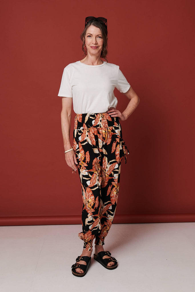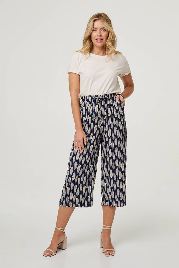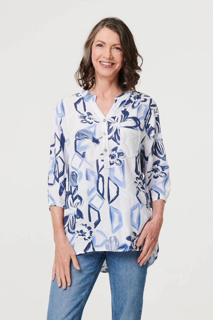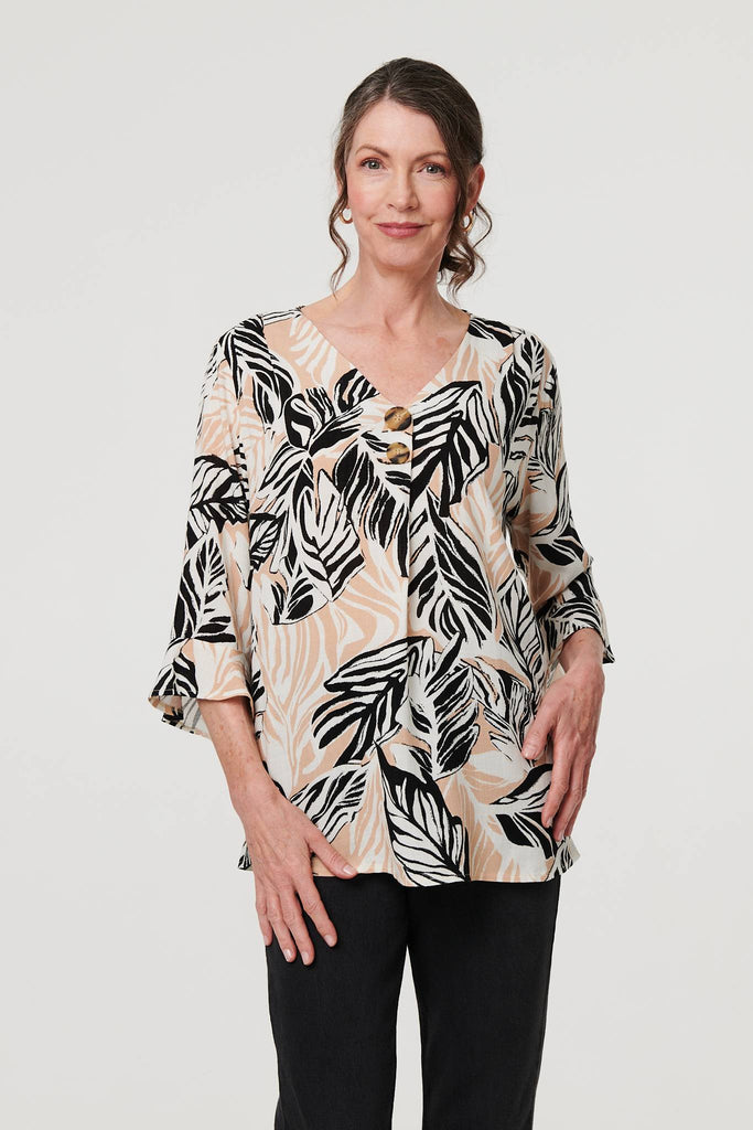 Leaf Print 3/4 Sleeve Button Trim Blouse